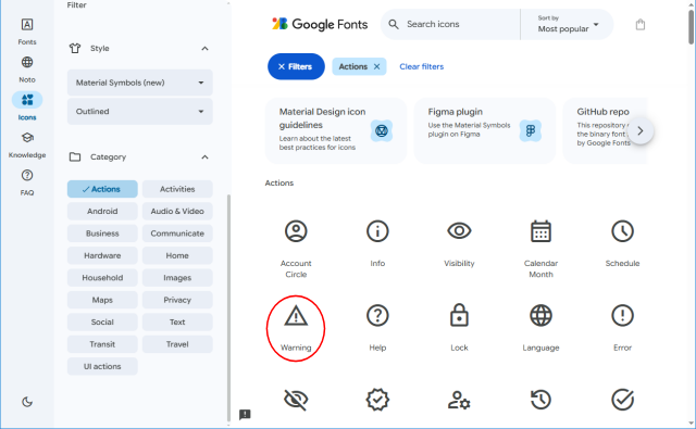 アイコンの数が多いため、左側のペインを下にスクロールしてカテゴリで絞り込みます。