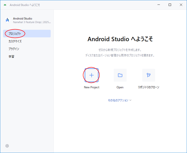新規プロジェクトの作成Android Studioを起動して、ナビゲーションの『プロジェクト』タブで『New Project』をクリックします。