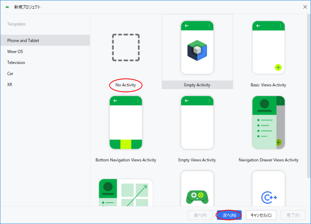 テンプレートの選択『Phone and Tablet』の『No Activity』を選択して空のプロジェクトを作成します。
