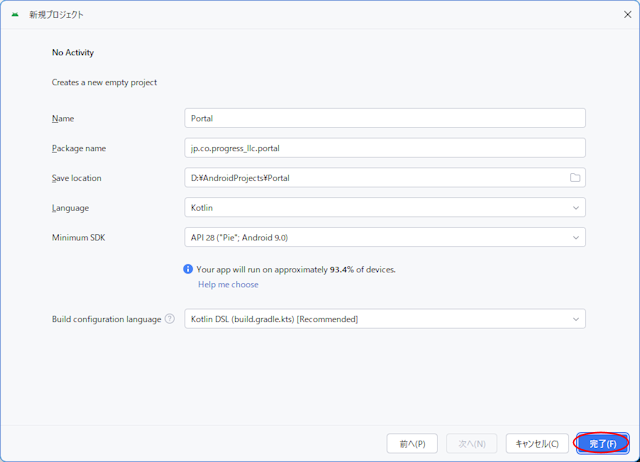 『完了(F)』でプロジェクトが作成されます。