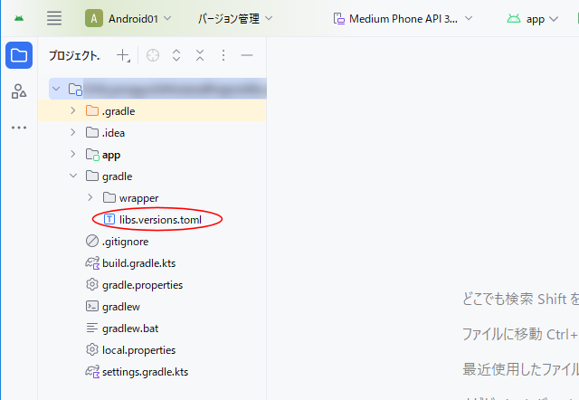 カタログファイルの編集バージョンカタログは、/gradle/libs.versions.toml に作成されています。