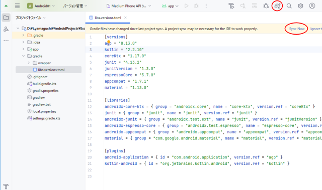 プロジェクトへの同期・反映バージョンカタログ等のファイルの内容を変更すると『Sync Now』が現れます。
