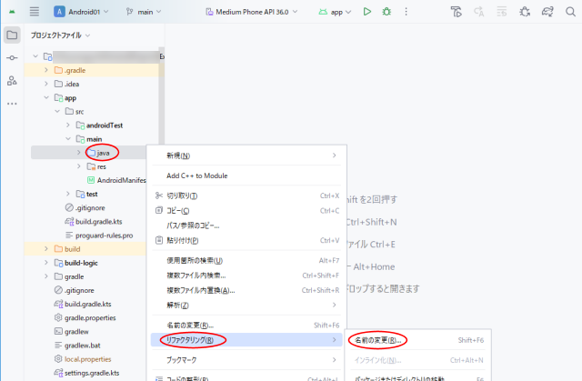 /app/src/main/java ディレクトリで右クリック➡『リファクタリング(R)』➡『名前の変更(R)…』へと進みます。