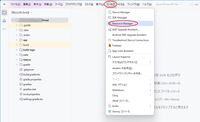 Android Studioのメニューバーから『ツール』で『Resource Manager』を開きます。