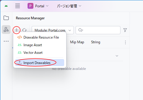 』アイコン➡『import Drawables』で取込むアイコンのxmlファイルを選択します。