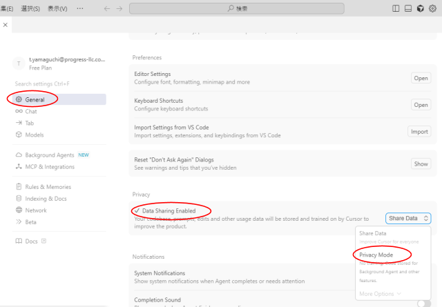 I'm fine with Cursor learning from my code or I'll turn it off in Settingに✅を入れます。