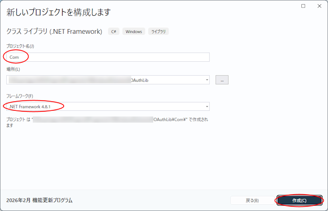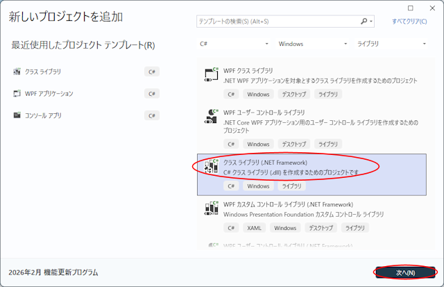C# Windows ライブラリからクラスライブラリ(.NET Framework)を選択します。