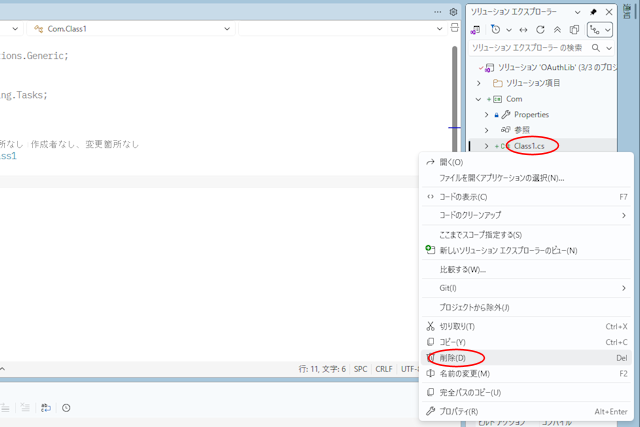 自動的に作成された『Class1.cs』を削除します。